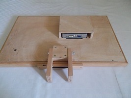 This is another LCD monitor modified for reducing the electromagnetic emissions. This particular monitor has a 21.5" 16:9 display but the screen resolution is 1920 x 1080, which is Full HD. The input is VGA or DVI. The backlight has been replaced with a 12 V LED strip. The mainboard is enclosed in a thick aluminum box. All the parts are powered with a linear power supply. The frame is made of solid walnut wood and the back is made of okume plywood. The wooden frame was needed because the original plastic and metal frame could not be reused with the aluminum box on the back. Respect to last year we have moved the metal enclosure of the main electronic board partially inside the stucture, and covered it with wood panels to protect it more.